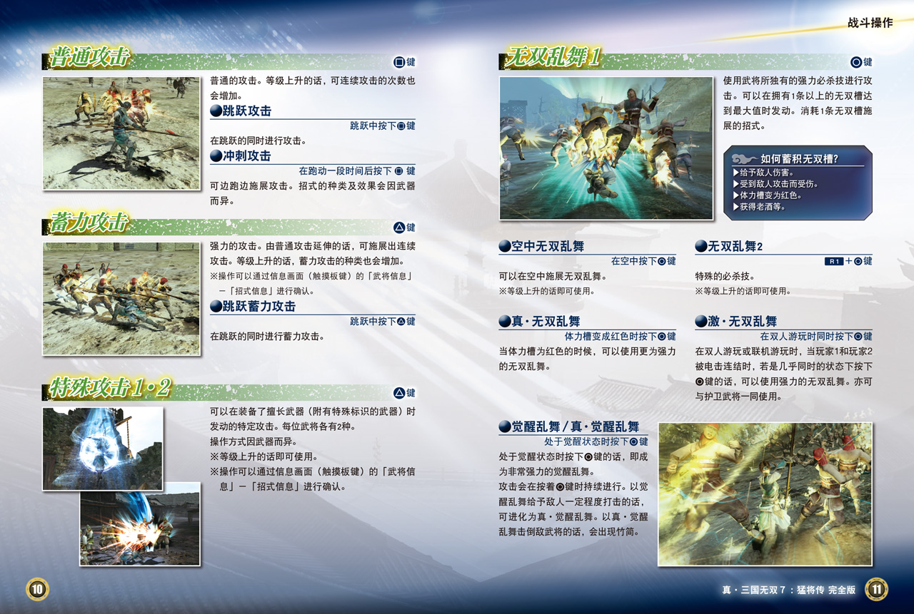 【真・三国无双7:猛将传 完全版 游戏说明书】 开始游戏的方法 | 战斗操作 | 画面的阅读方法 | 武将的成长 | 护卫武将 | 故事模式 | 自由模式 | 将星模式 | 挑战模式 | 联机游玩 | 武将介绍 | 客户服务
