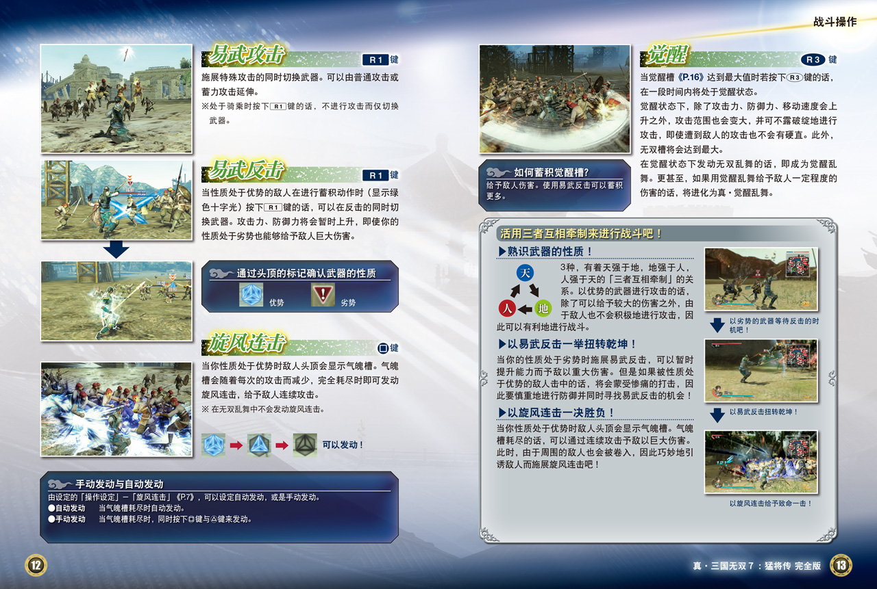 【真・三国无双7:猛将传 完全版 游戏说明书】 开始游戏的方法 | 战斗操作 | 画面的阅读方法 | 武将的成长 | 护卫武将 | 故事模式 | 自由模式 | 将星模式 | 挑战模式 | 联机游玩 | 武将介绍 | 客户服务