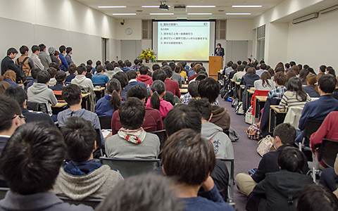 庆应义塾大学的学生们挤满了整个会场。参加的学生人数比预定人数超出了一倍以上,有人坐在过道中,有人站着听讲,甚至连会场外也设置了旁听席,场内气氛十分热烈。