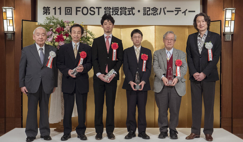 (照片左起)FOST奖审查委员长东海大学名誉教授白鸟令先生、FOST社会贡献奖广濑幸雄先生、FOST新人奖长谷川达人先生、荣膺FOST奖的北海道大学研究生院准教授大沼进先生与东京工业大学研究生院教授出口弘先生、FOST理事长本光荣特库摩控股集团代表取缔役社长襟川阳一先生
