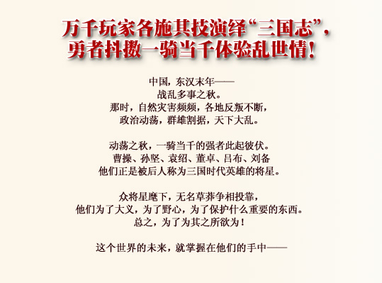 本作以曹操、孙坚、刘备三雄及其属下关羽、吕布、夏侯惇、诸葛亮、周瑜等众多武将活跃的中国古代为舞台。游戏中的一天相当于现实时间的一个小时,玩家在游戏世界中进行“激战”,战斗的结果将会对各个势力的国力有所影响。当积累一定的战果以后便会发生城市“争夺战”!