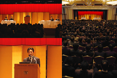 聚集在帝国酒店富士厅会场中的1200名员工。集团新员工的介绍也是在这里进行的。 |