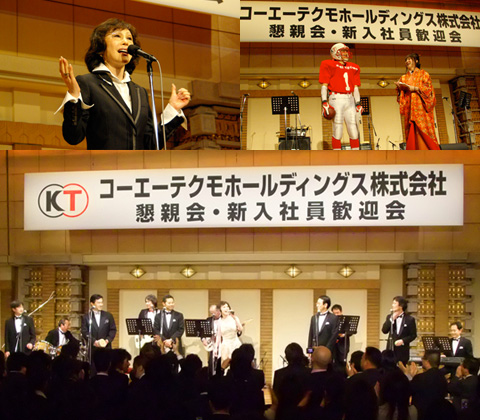 以“新的挑战”为主题组成的董事乐队表演了《来自伊帕内玛的女孩》、《岸边的回忆》、《戴安娜》三首曲目。乐队成员为:前排左起原毅执行董事、松原健二总经理、柿原康晴董事长、襟川惠子董事、阪口一芳董事、伊从胜执行董事(以上是演唱人员)。后排左起 鼓手:小林伸太郎执行董事、贝司手:襟川阳一董事、吉他手:光荣常务执行董事保坂正敏、吉他手:光荣执行董事真保安一郎、键盘手:杉山芳树执行董事。 |