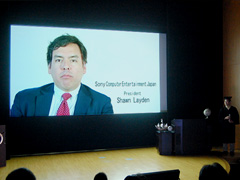 (右)Sony Computer Entertainment Japan总裁肖恩·雷登先生的视频信息。“网络世界正在日新月异地进化,《大航海时代 Online》也在不断地进化着。《大航海时代 Online》这款优秀的在线RPG游戏能够在PS3上提供服务,是多么令人开心的事情啊。”
