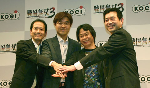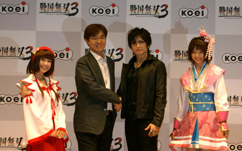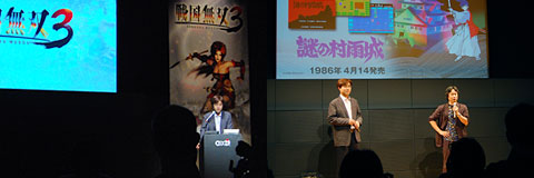 (左)华丽登场的GACKT先生 (右上)首次看到游戏演示而兴奋不已的美甘子小姐和小日向小姐。右面是开发指导远藤融。(右下)发布会之后举行的试玩会