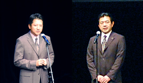 (左)SONY COMPUTER ENTERTAINMENT JAPAN总裁、河野弘先生发表感想:“除‘无双’系列作品外,再无其他历史题材游戏能够受大众喜爱达10年之久,它可以说是PLAYSTATION平台的珍宝。”(右)光荣特库摩控股公司总经理、松原健二:“在今后的10年里,希望‘无双’系列能够继续振翅高飞。”