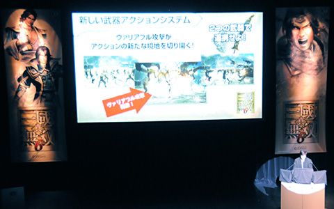 《真·三国无双6》制作人铃木亮浩在会场上登台讲解游戏概要。除播放支持3D立体视像的宣传影像之外,他还进行了实机演示,为观众介绍本作的特征。
