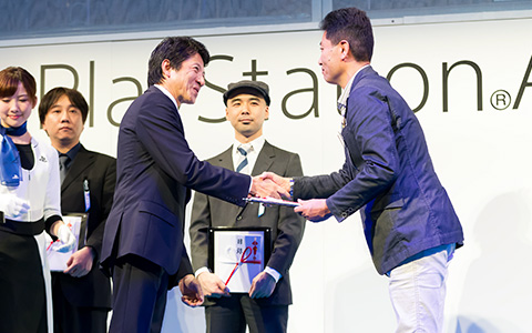 从索尼电脑娱乐公司日本亚洲总裁河野弘先生(左)手中接过奖状的游戏制作人小笠原贤一。