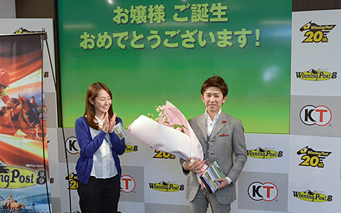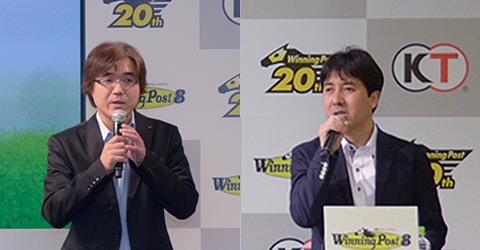 (左)鲤沼久史:“之所以能利用模拟类游戏开发的诀窍和襟川社长作为马主的经验,顺利地完成游戏的制作,都得益于各位玩家的支持”。