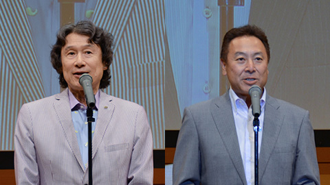 (左)日本光荣特库摩游戏公司代表取缔役社长襟川阳一。