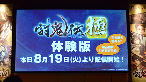 索尼电脑娱乐集团日本亚洲公司的高级副总裁植田浩先生登场,发表了热情洋溢的讲话:“光荣特库摩公司举办了众多的发布会,可以说是绝无仅有的、十分重视号召玩家、与玩家对话的公司。此次的《讨鬼传 极》也是十分重视这种“对话”立场的、光荣特库摩风格的作品。作为今年夏天首推的作品,索尼电脑娱乐也将全力支持《讨鬼传》系列”。