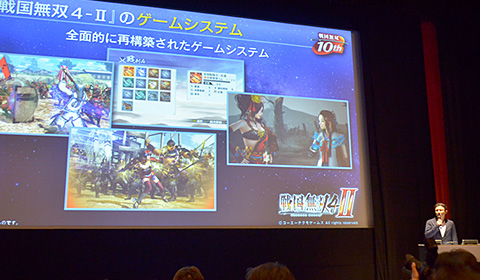 鲤沼久史穿着充满新年气息的和服登场,向大家致辞:“《战国无双4-Ⅱ》作为《战国无双》10周年的闭幕之作,即将问世。开发团队进行了诸多新的尝试,全都充满了干劲。”致辞后,初次公开了开篇动画的影像。