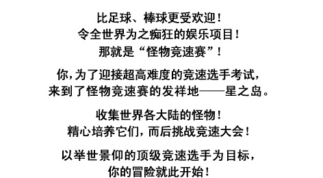 玩家可以让自己亲自发现、培养起来的怪物出场比赛,并亲身操控。将孩子们热衷的收集、培育元素和竞速动作的乐趣相结合,成就了本作独一无二的游戏系统。 本游戏中能够体验到多种多样的乐趣,玩家可以环游世界,收集个性各异的怪物,也可以挑战各种比赛来提升等级。玩家就在这样的过程中,和自己精心培养的怪物一起,向着世界最强怪物竞速选手的目标前进。