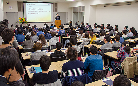庆应义塾大学的学生们挤满了整个会场。参加的学生人数比预定人数超出了一倍以上,有人坐在过道中,有人站着听讲,甚至连会场外也设置了旁听席,场内气氛十分热烈。