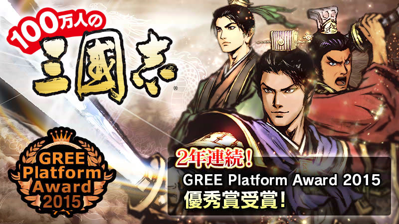 由本公司开发、运营的社交模拟游戏——GREE版《100万人的三国志》继去年之后,在GREE公司(本社:日本东京都港区、代表取缔役会长兼社长:田中良和)发布的“GREE Platform Award 2015”中,再度荣膺优秀奖。