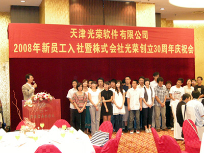 天津光荣软件有限公司08年新员工就业欢迎会暨母公司株式会社光荣(KOEI)创立30周年纪念会,于2008年8月27日晚,在天津水晶宫饭店三楼水晶厅隆重举行。株式会社光荣伊从会长一行五人专程来津,出席了纪念会。