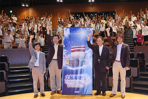 | 扮成航海者学校教官的《大航海时代 Online》的运营制作人渥美贵史(右)、开发制作人竹田智一(中)、游戏主设计师山田伦之(左)。他们每次登场,场内都会欢声雷动。 |
