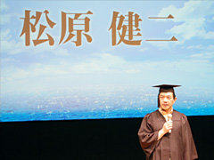 (左)头戴学士帽,身穿披风,扮成航海者学校校长的KOEI TECMO控股公司总经理松原健二登台致词。“在大航海时代,海洋是未知的开拓地。现代的开拓地则是宇宙。而网络世界也是一样,还有很多未开拓领域。只要在这里开拓下去,我相信必将收获更加丰富多彩的产品。”