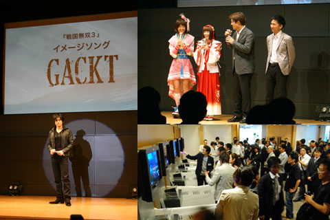 (左)华丽登场的GACKT先生 (右上)首次看到游戏演示而兴奋不已的美甘子小姐和小日向小姐。右面是开发指导远藤融。(右下)发布会之后举行的试玩会