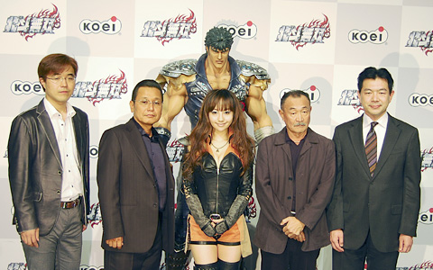 (左起)光荣《北斗无双》开发制作人鲤沼久史、《北斗之拳》漫画家原哲夫先生、歌手谷村奈南小姐、《北斗之拳》原作者武论尊先生、KOEI TECMO控股公司总经理松原健二。 |