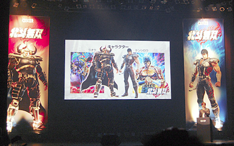 《北斗无双》开发制作人鲤沼久史正在说明游戏概要。介绍了“传说篇”和“幻斗篇”两个游戏模式,展示了实机游戏动画。 |