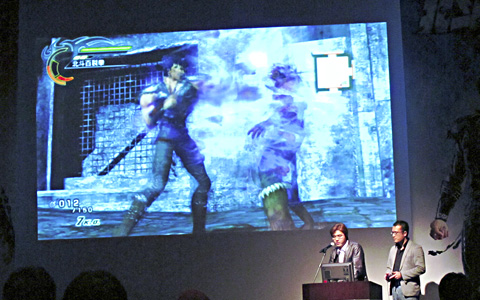 对游戏概要进行说明的鲤沼久史和对PS3版《北斗无双》进行实际操作的开发指导狩野直士(右)。