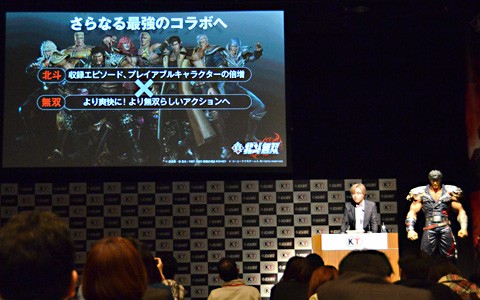 (照片左)《真·北斗无双》的游戏制作人鲤沼久史介绍游戏概要。用动画介绍了在本作中追加的剧本和新的游戏系统。