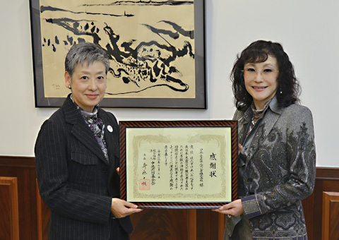 接受感谢信的日本光荣特库摩集团名誉会长襟川惠子女士(照片右)
