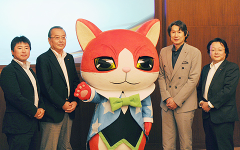 (照片从左起)日本光荣特库摩游戏公司常务执行役员网络事业部副部长藤重和博、专务取缔役网络事业部长小林伸太郎、GAMECITY市长NYABURAHAMU RINNYAN、代表取缔役社长襟川阳一以及执行役员门户服务负责人藤田一巳。